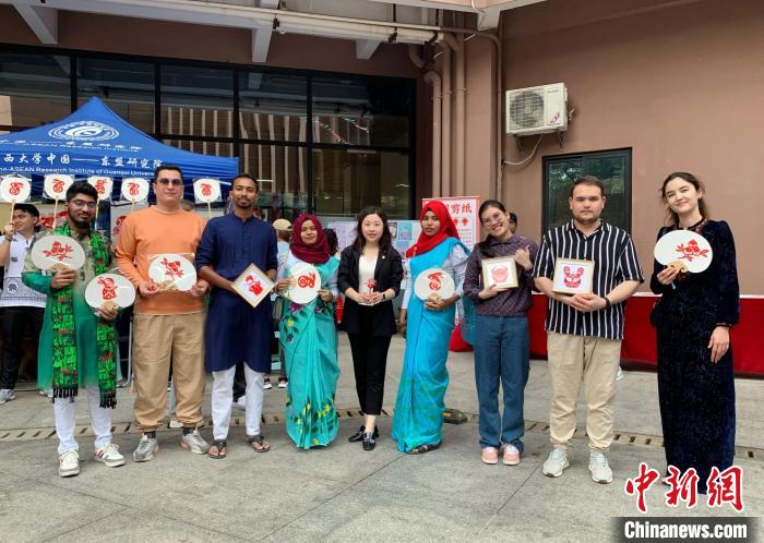 圖為留學生展示剪紙作品?!V西大學國際學院供圖