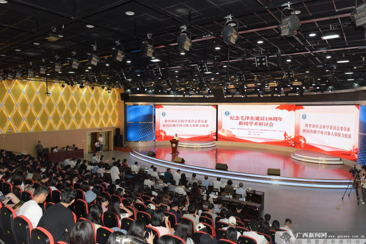 為紀念毛澤東同志誕辰130周年,推進毛澤東新聞思想與馬克思主義新聞觀研究,9月23-24日,由教育部社會科學委員會語言文學、新聞傳播學和藝術學學部和廣西大學共同主辦、廣西大學新聞與傳播學院承辦的“紀念毛澤東誕辰130周年新聞學術研討會”在廣西大學舉行。專家學者歡聚一堂,探討毛澤東新聞思想的豐富內涵與當代啟發,學習貫徹習近平總書記關于新聞輿論工作的重要論述,共話新時代黨的新聞事業。全國50多所高校、研究機構和媒體單位的130余名專家學者、碩博士研究生參加會議。