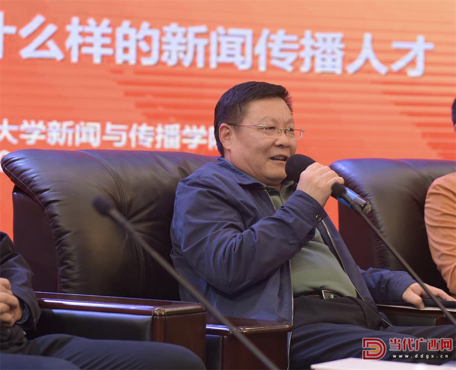 中央廣播電視總臺廣西總站原黨委書記劉發丁在發言中表示,新時代成為一名合格的新聞人才,第一要有理想;第二要樹立正確價值觀;第三要有深厚的知識積累、扎實的文字功底;第四要有吃苦耐勞的精神;第五要掌握一定的傳媒技巧和方法。通訊員 唐馨怡 攝