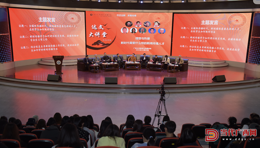 12月5日下午,“達文大講堂”校友論壇在廣西大學新聞與傳播學院融媒體中心舉行。論壇以“理想與熱愛:新時代需要什么樣的新聞傳播人才”為主題,邀請7位知名校友作嘉賓,圍繞主題就如何學習貫徹習近平文化思想作了廣泛深入的交流和探討。