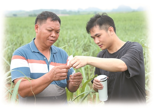 廣西大學“蔗種康甜”團隊成員向蔗農介紹甘蔗病毒快速檢測試劑盒的用法。李藝寒/攝