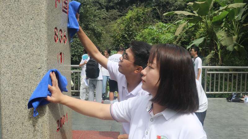 暑假期間,廣西大學資源環(huán)境與材料學院實踐團成員來到廣西大新縣,擦拭836號界碑。陳燕波/攝